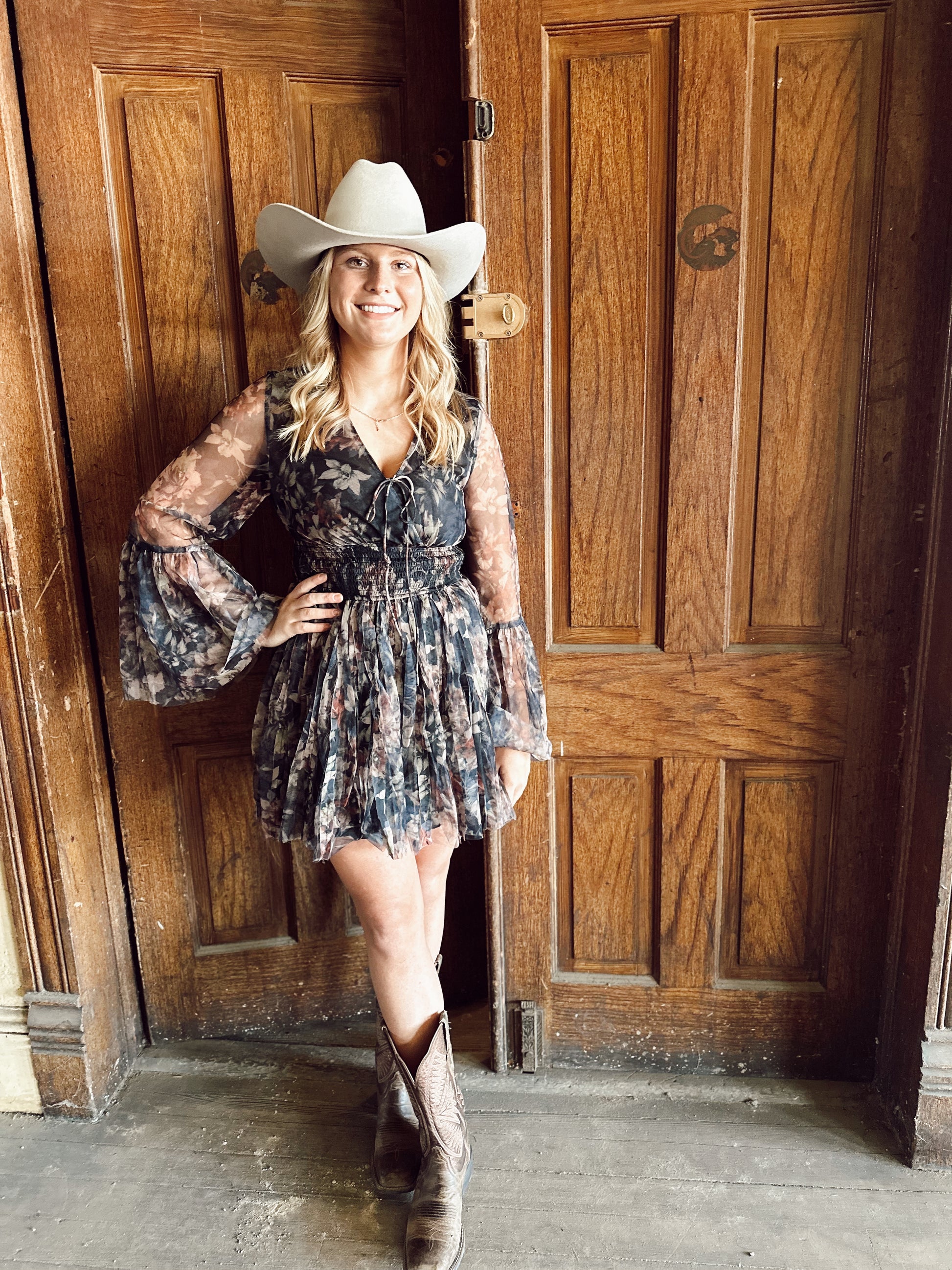Soft, romantic, and made to move with you. This floral chiffon mini features sheer, billowy sleeves and a tiered skirt that’s full without feeling heavy. The smocked waist gives stretch and shape, and the tie-front neckline lets you style it looser or more fitted. It’s one of those dresses that feels special but still comfortable — easy to wear, easy to love.