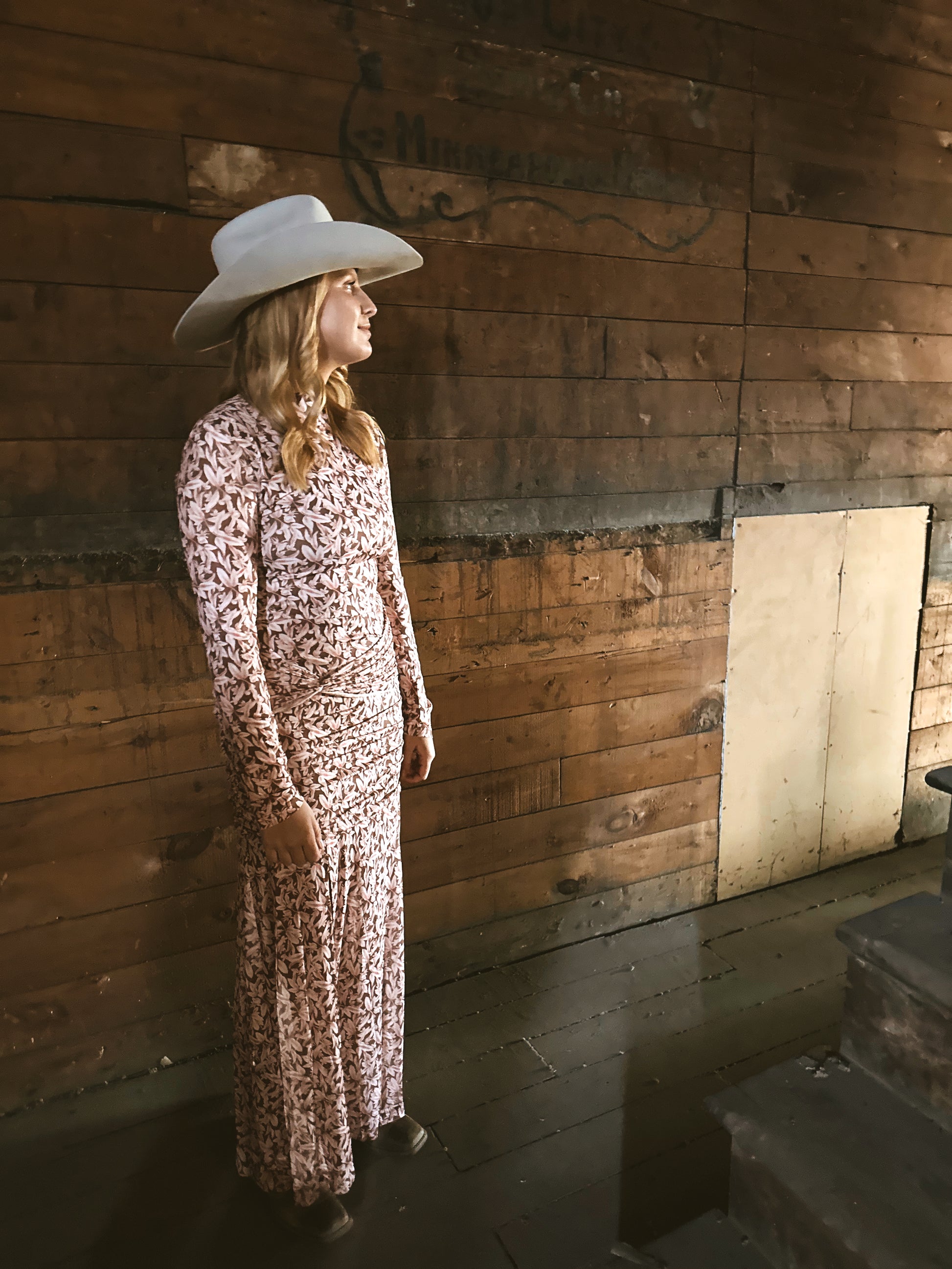 Soft, effortless, and just the right amount of statement. This long-sleeve maxi dress features a romantic rouge floral print with a flattering ruched waist that hugs in all the right places and moves with you. There is an ample amount of stretch in the fabric, giving it a comfortable, easy fit that doesn’t feel restrictive. The high neckline keeps it refined, while the side slit brings just enough leg to feel confident and feminine. Pair it with your favorite cowboy boots for that “ready for the dance floor or the front porch” kind of look.