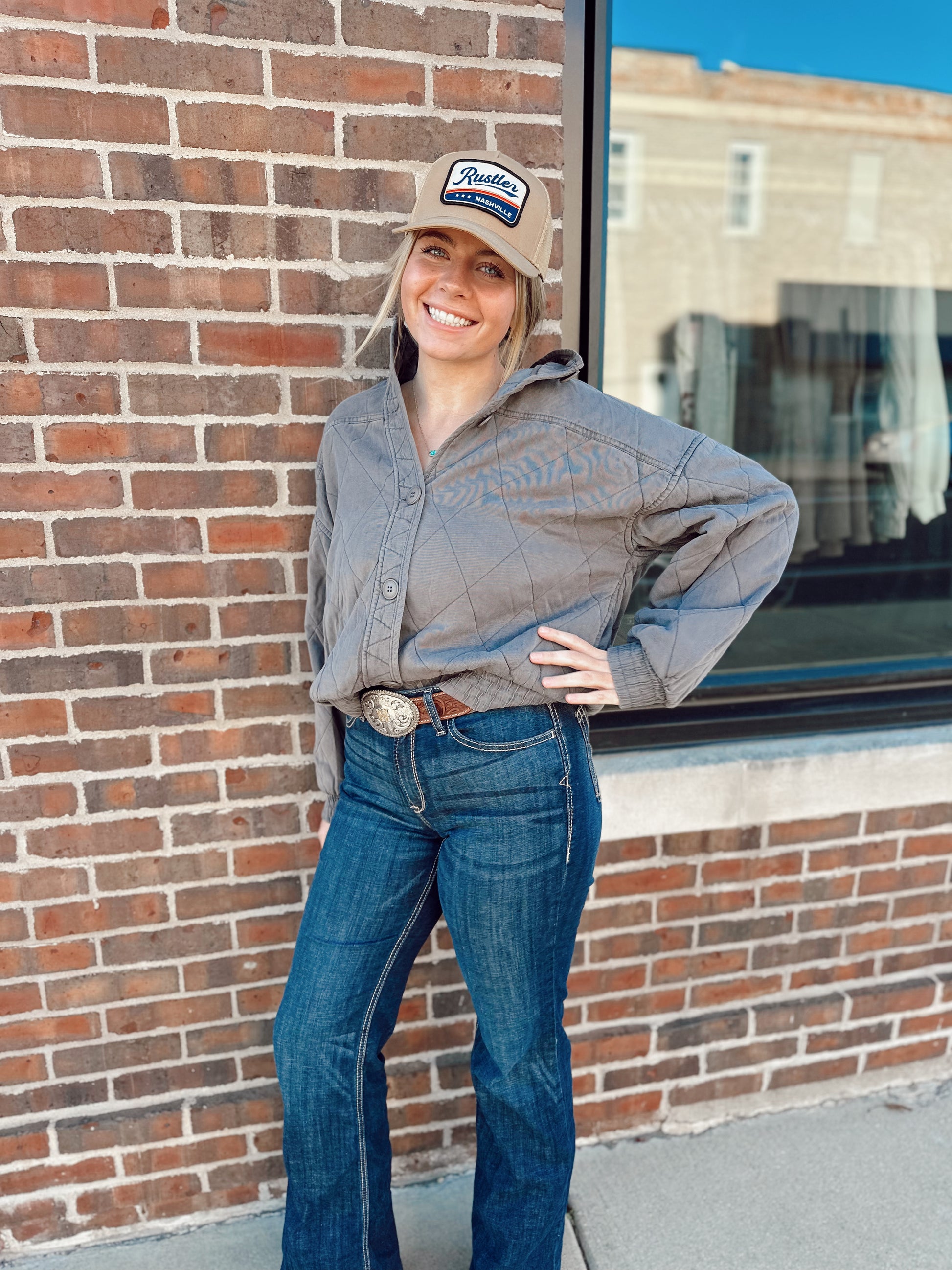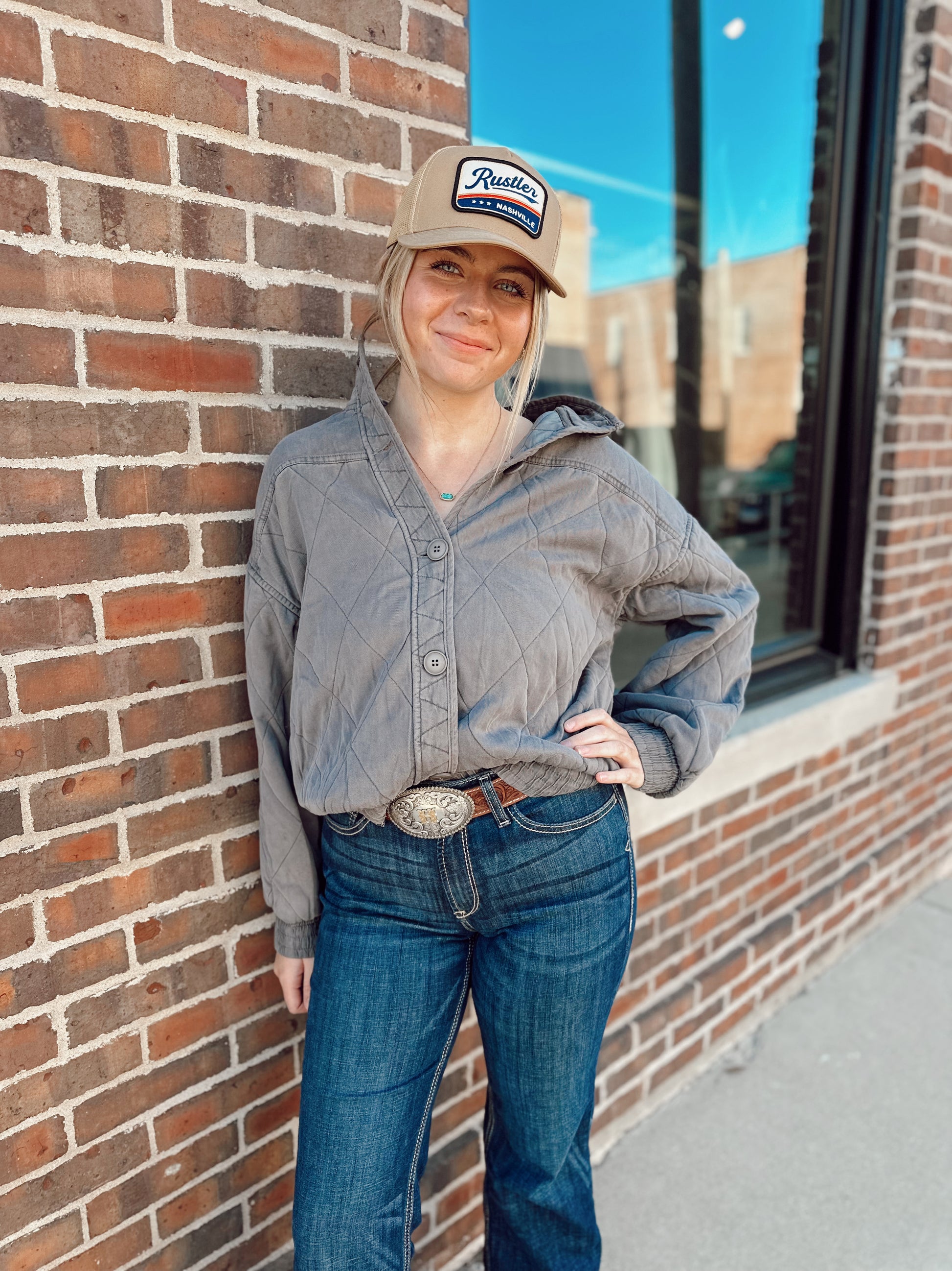 Washed charcoal grey with subtle western stitching + a slouchy collar you can pop, fold, or let be.