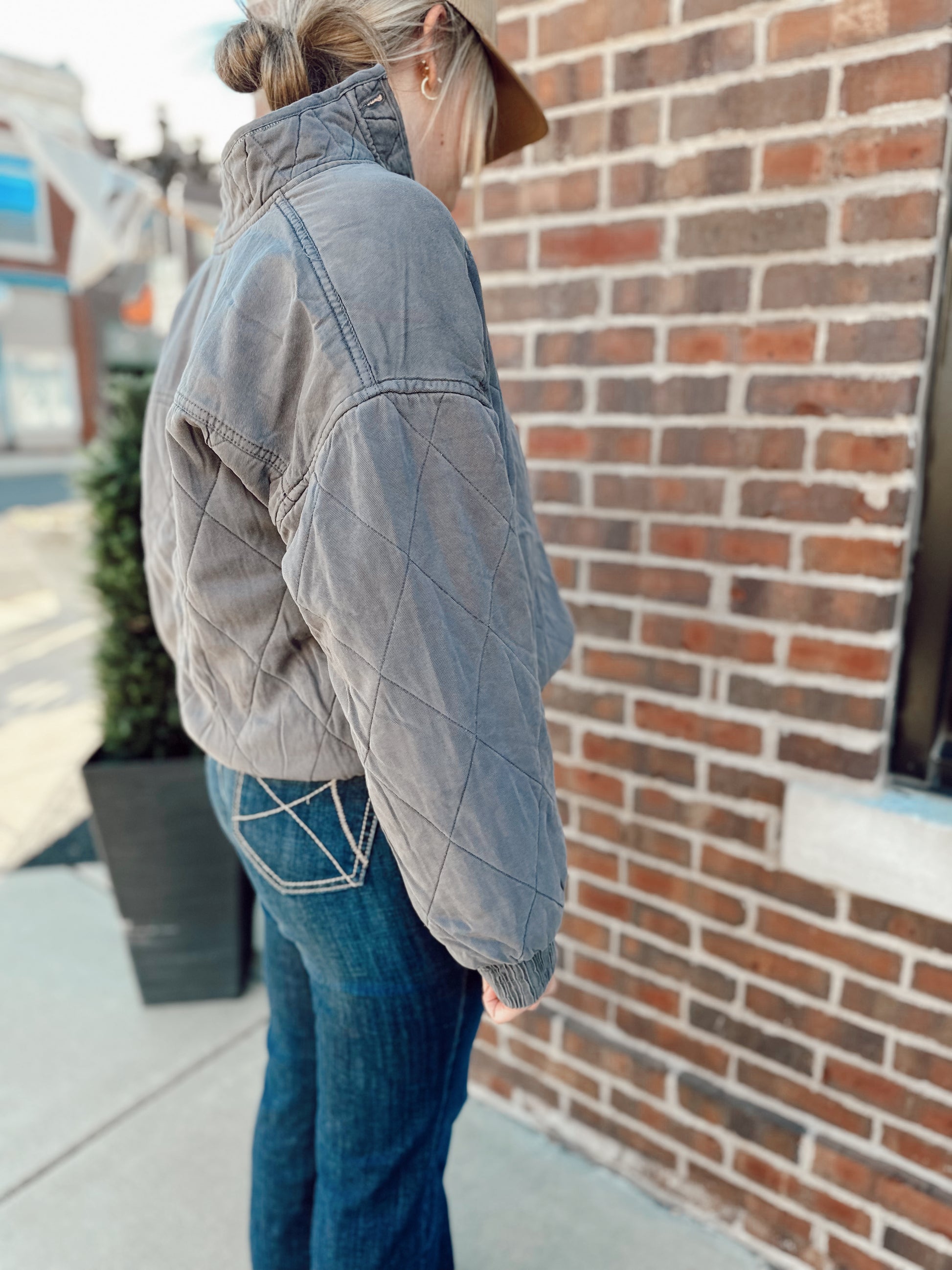 The Quilted Trailblazer Jacket — she’s lightweight, oversized, and looks like you “just threw it on” (but in the effortless, I-have-my-life-together way).