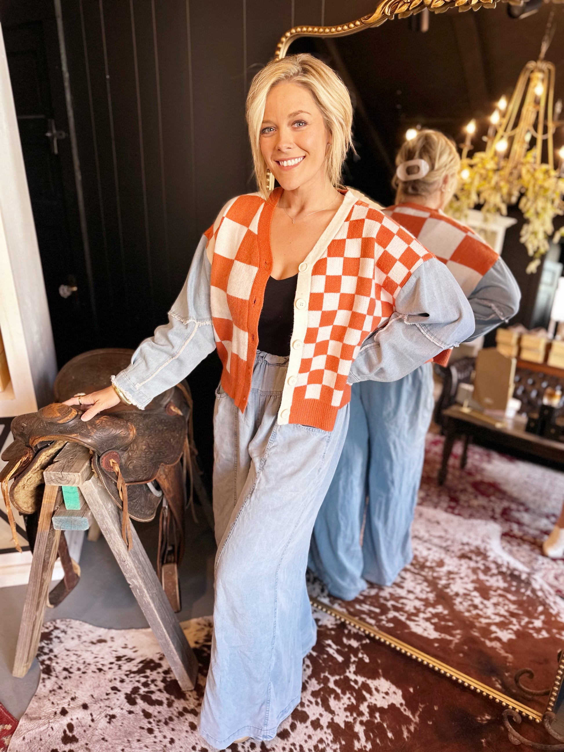 The Sunset Check Sweater is the cardigan you’ll keep reaching for—easy, fun, and full of personality.