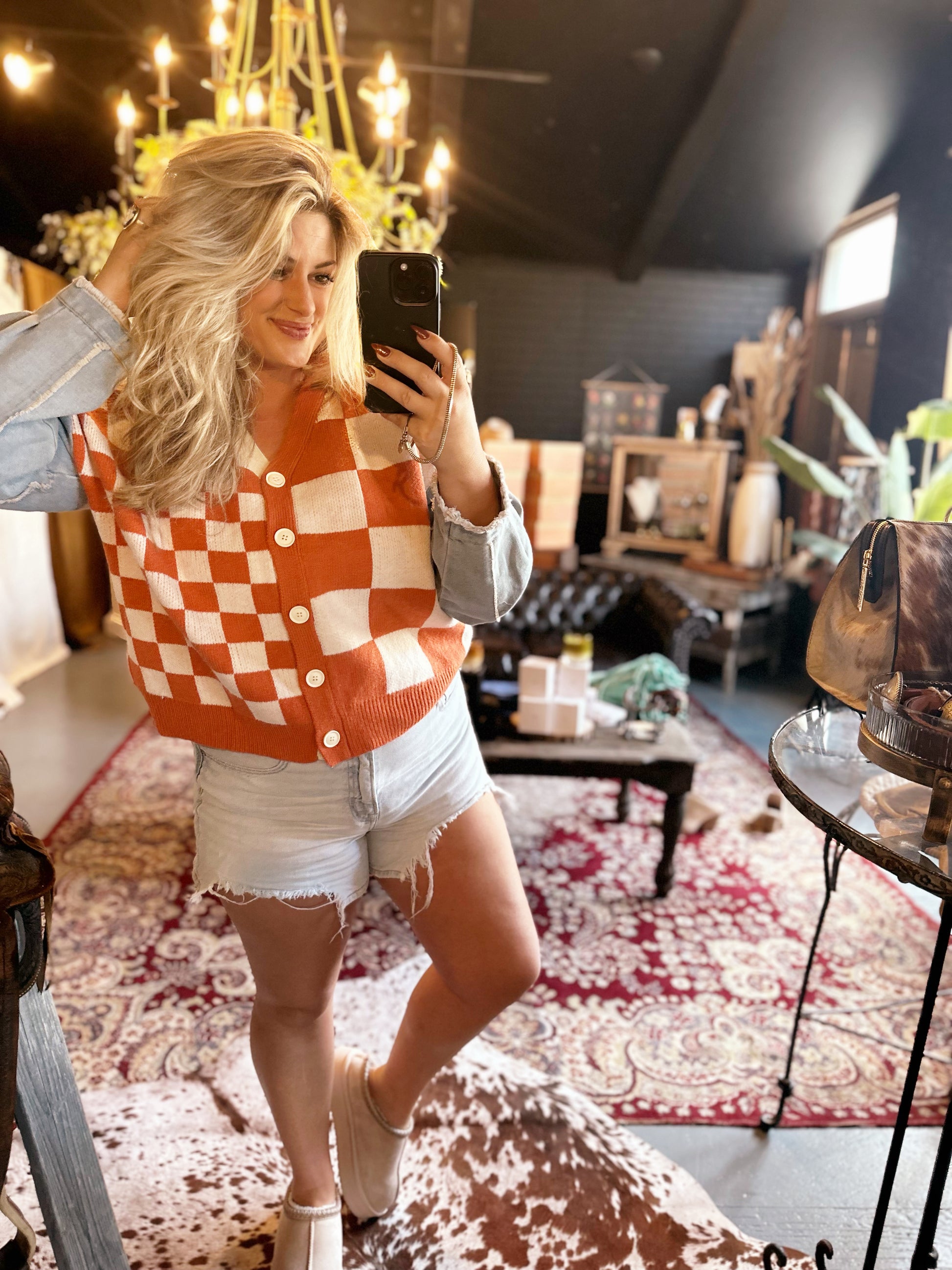 The Sunset Check Sweater is where bold meets cozy. With its vibrant orange-and-cream checkerboard pattern, this piece adds instant personality to any outfit. Designed with a button-front closure and relaxed silhouette, it’s lightweight yet soft enough to carry you through every season.