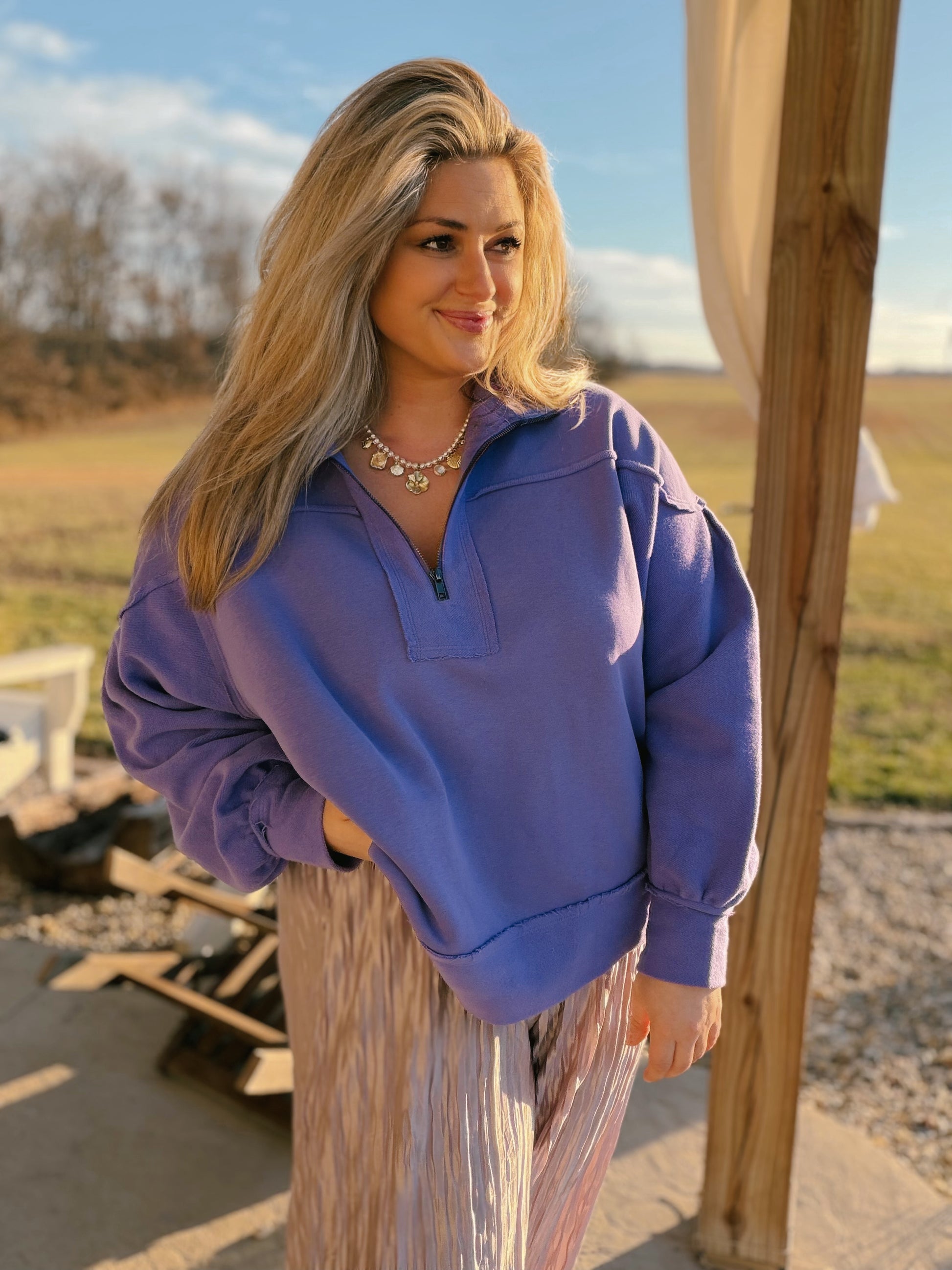 The Switchback Purple Quarter-Zip Pullover is made from an ultra-soft fabric with a relaxed, oversized fit that feels effortless and lived-in from the first wear. Designed with a classic quarter-zip neckline, dropped shoulders, and roomy sleeves, this pullover is perfect for everyday wear — whether you’re running errands, working from home, or heading out for a casual day.