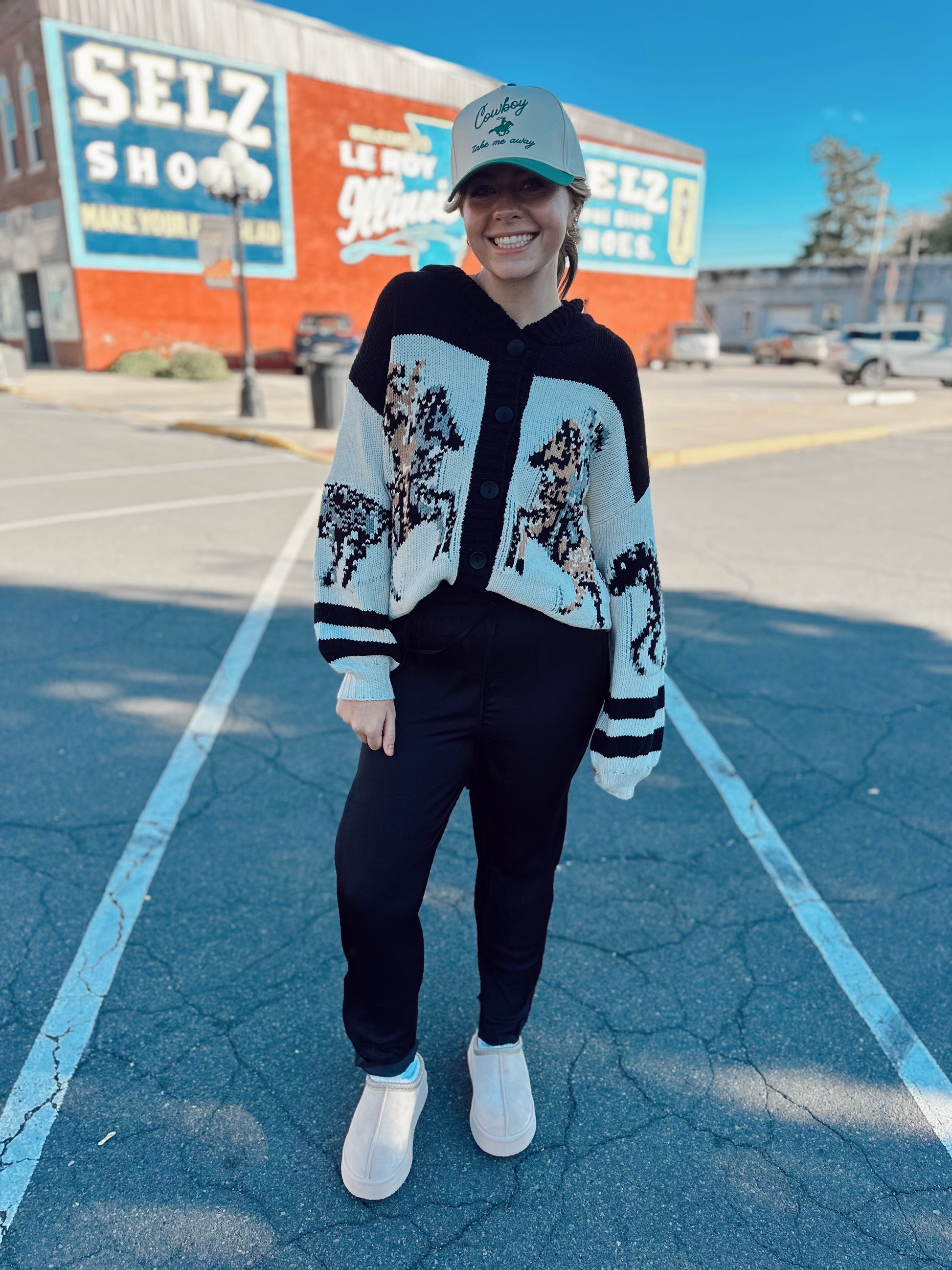 The Absarokee Cardigan was made for the days when the air’s crisp and your spirit feels wild. Featuring a bold pixel-style horse design galloping across the front and back, this knit brings a touch of western heritage to cozy layering. With its shawl collar, button front, and soft relaxed fit, it’s the perfect mix of warmth and wander.