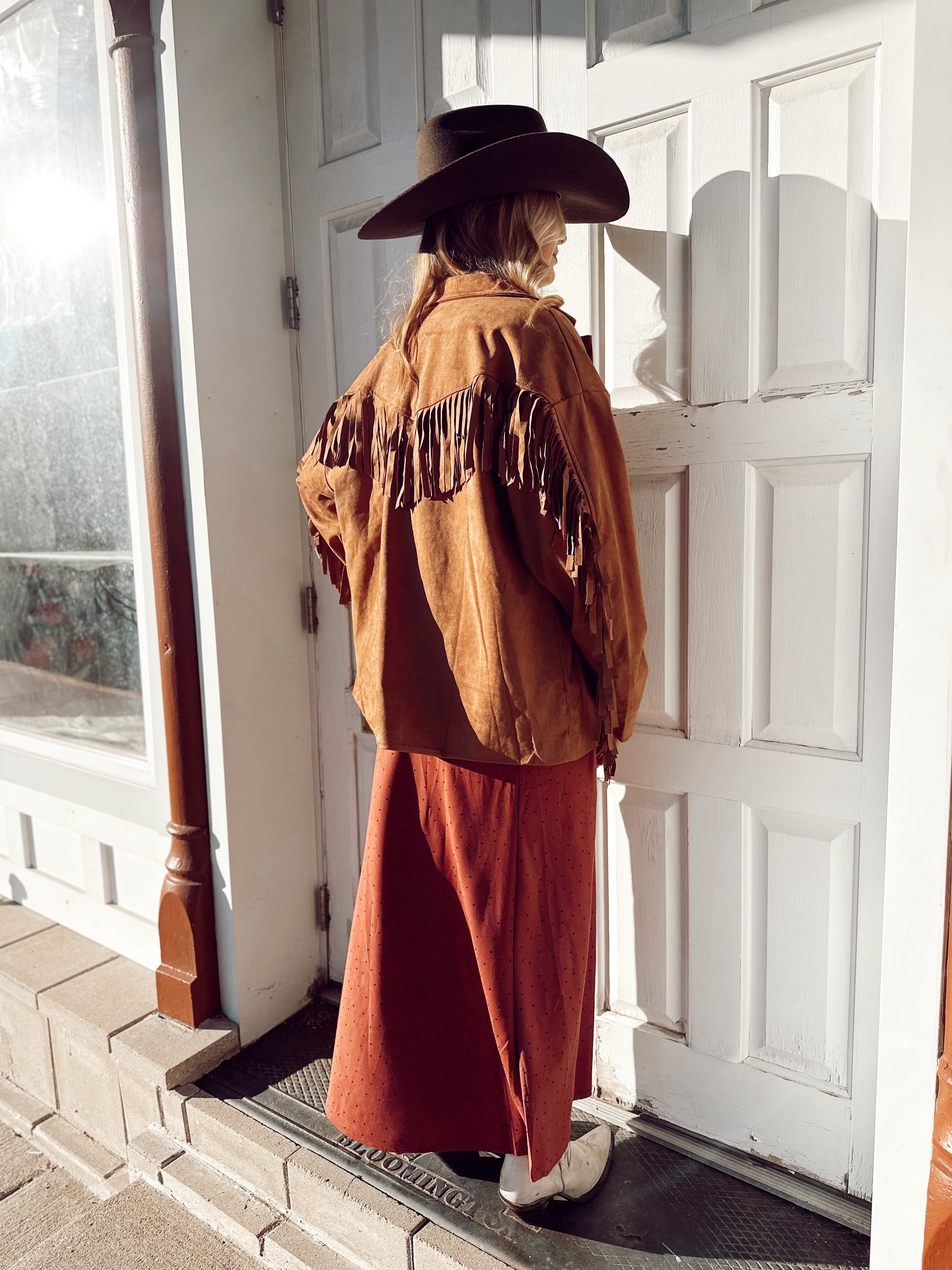 The Amarillo Jacket brings that timeless western flair with a touch of bold femininity. Made from soft, faux suede with full fringe detailing across the back and sleeves, it’s equal parts statement piece and closet staple. Easy to throw on over dresses, denim, or a graphic tee — this one turns every outfit into a moment.
